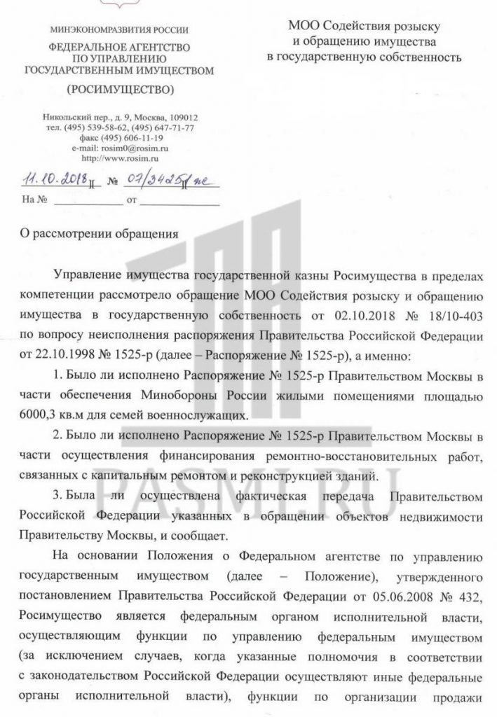 Не волнует история с передачей Москве дорогой государственной недвижимости и невыполнением столицей встречных обязательств и Федеральное агентство по управлению государственным имуществом. В ответ на запрос общественников, желавших узнать, было исполнено мэрией Москвы распоряжение российского правительства по передаче жилья военнослужащим, там ответили, что данный вопрос — не в компетенции ведомства.