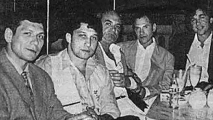 Слева направо: авторитет курганской ОПГ Олег Нелюбин, Анатолий Гусев, четвёртый — Андрей Колигов, криминальный авторитет Черкас