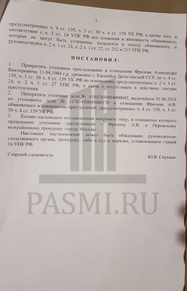 После того, как Перовский суд вернул материалы по Фролову следствию, уголовное дело против экс-руководителя отдела участковых уполномоченных по району Вешняки было прекращено, и его выпустили на свободу.