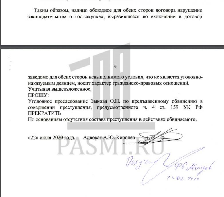 В июле 2020 года защита Олега Зыкова обратилась к следователю Фариду Мамедову с ходатайством о прекращении уголовного дела за отсутствием состава преступления. Там, в частности, указывалось, что исполнение договора с заведомо невыполнимым для обеих сторон условием не является уголовно наказуемым деянием, а носит характер гражданско-правовых отношений. Ходатайство было оставлено следователем без удовлетворения.