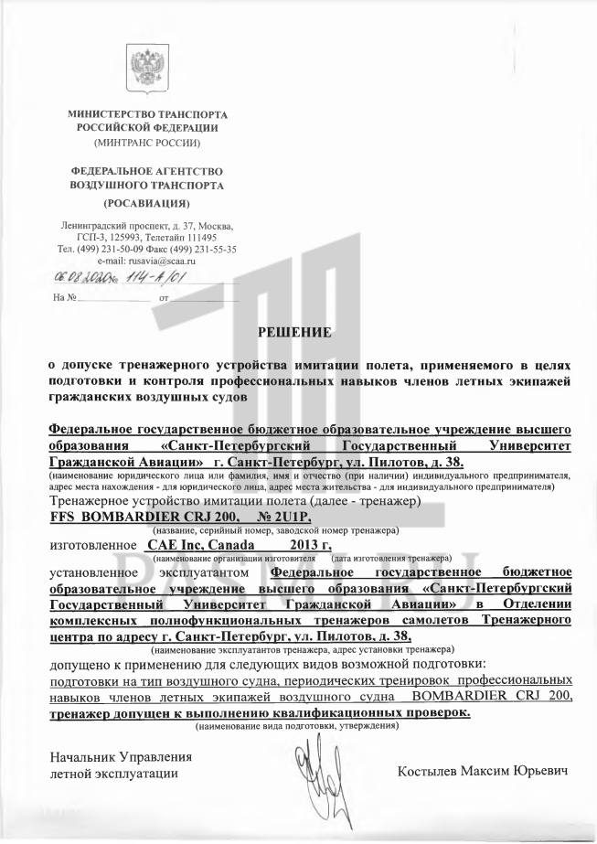 Дело по факту хищения бюджетных средств в размере 358,9 млн рублей при выполнении контракта на поставку в Санкт-Петербургский государственный университет гражданской авиации (СПб ГУ ГА) тренажера самолета Bombardier CRJ200 было возбуждено по материалам УЭБиПК ГУ МВД по Санкт-Петербургу и Ленинградской области и регионального управления ФСБ.