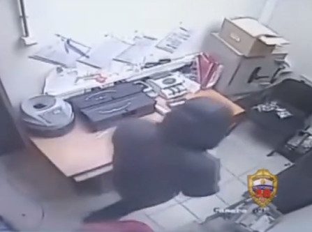 На кадрах видно, как неизвестный в капюшоне заходит в служебное помещение магазина, открывает сейф, неспешно забирает его содержимое и уходит.