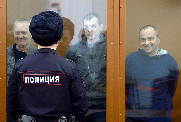 Члены движения «Артподготовка» во время оглашения приговора (слева направо): Сергей Озеров, Олег Иванов и Олег Дмитриев