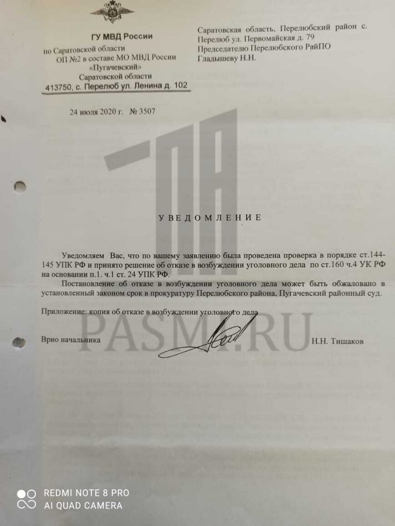 В феврале 2020 года правление кооператива написало в Следственное управление по Саратовской области заявление о признаках хищения средств путем “теневой” торговли и сомнительных кредитов. Однако, материалы были переданы в региональное ГУ МВД и после недолгих разбирательств — в июле 2020 года — полиция вынесла постановление об отказе в возбуждении уголовного дела.