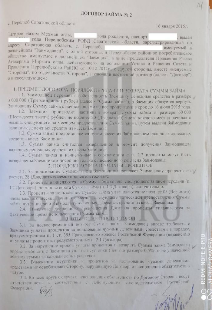 Согласно этому договору, Тагиров дал кооперативу в долг 3 млн рублейсроком на шесть месяцев. Из объяснений Рзаева, которые он позже озвучил в суде, средства понадобились организации, чтобы досрочно погасить кредит в “Россельхозбанке”.