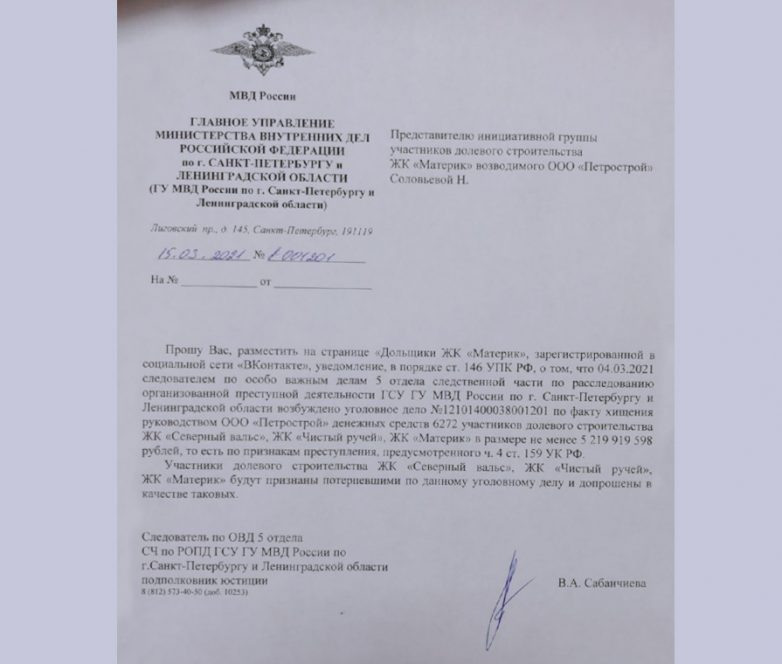 Главное следственное управление ГУ МВД РФ по Санкт-Петербургу и Ленинградской области возбудило уголовное дело о мошенничестве против руководства одного из крупнейших местных застройщиков — компании «Петрострой».
