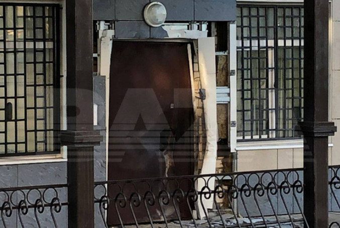 Дверь отдела полиции в Лисках, поврежденная взрывом