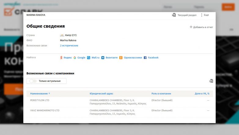 Лайф проверил фирмы с таким названием и нашёл подобную на Кипре в городе Лимасол — Peristylon LTD. Директор — Марина Ракова. По тому же адресу нашлась ещё одна фирма под её руководством — Vkaz Mandarinoto LTD.