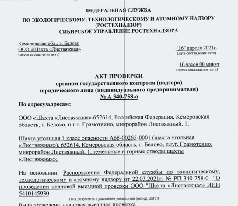По информации Лайфа, шахту «Листвяжную» на соответствие требованиям безопасности проверял начальник Беловского территориального отдела Ростехнадзора Александр Трокман. Как председатель выездной ревизионной комиссии, он подписал акт, который есть в распоряжении редакции. Проверка Трокмана проходила в апреле 2021 года и длилась 10 дней. Инспектор нашёл 139 нарушений: не хватало персонала для безопасной эксплуатации оборудования, средств пожаротушения и защиты от электрического тока, при расчёте опасной зоны указывалась устаревшая информация, на горно-геологическом прогнозе отработки лавы отсутствовало фактическое положение скважин, не заземлены распределительные коробки, начальство не знало систему нарядов, нарушена целостность кровли надшахтного здания и так далее.