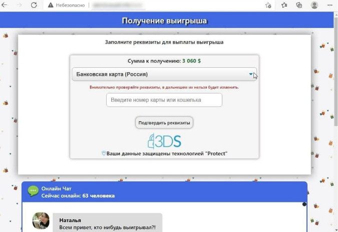 Уточняется, что через некоторое время жертву с лже-сайта Минздрава перенаправляют на мошеннический сайт с розыгрышем или получением «крупного денежного перевода» в размере 237,568 тыс. рублей, средства можно якобы вывести в течение двух дней, при этом необходимо ввести данные банковской карты.