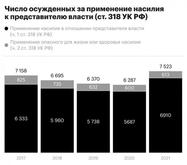 В 2021 году число осужденных за применение насилия по отношению к представителю власти (ст. 318 УК) составило 7523 человека. Большей части — 6910 человек — приговор вынесли по ч. 1 ст. 318 УК (применение неопасного для жизни или здоровья насилия); 613 человек осудили за насилие, представляющее такую опасность.