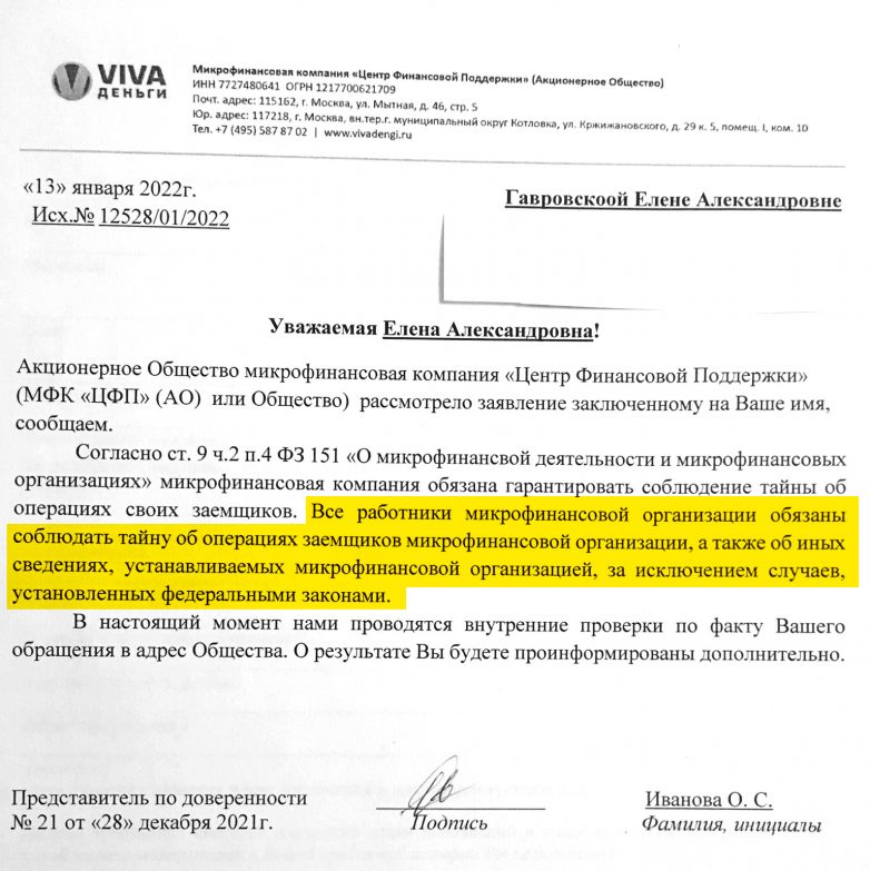 В письме Елене Гавровской из компании «ЦФП» сообщалось, что работники микрофинансовой организации «обязаны соблюдать тайну о заемщиках микрофинансовой организации», несмотря на то что эту «тайну» просила открыть сама «заемщица»