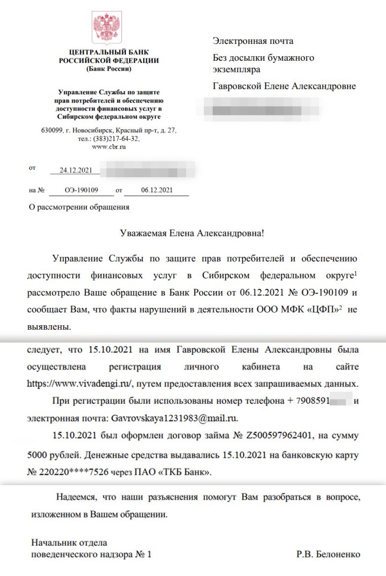 В конце 2021 года пострадавшая Гавровская получила официальный ответ на свое обращение в Центральный банк Российской Федерации. В документе сообщалось, что Банк России не обнаружил фактов нарушений в деятельности ООО МФК «ЦФП», деньги были выданы через сайт Vivadengi.ru на банковскую карту через ПАО «ТКБ Банк», а договор подписан с помощью аналога собственноручной подписи 15 октября 2021 путем ввода одноразового кода. Женщине также объяснили, что следует делать в таких ситуациях.