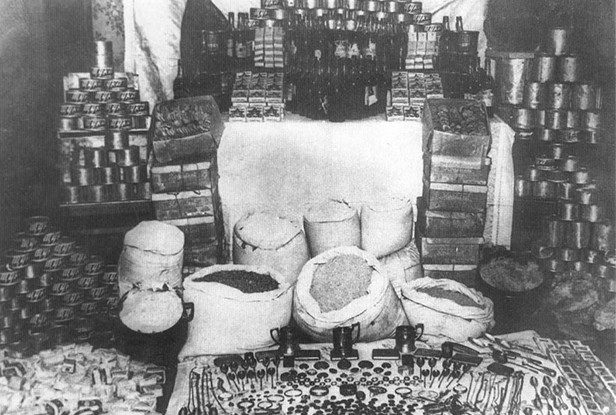 Продовольствие и изделия из драгоценных металлов, изъятые сотрудниками уголовного розыска у преступников в блокадном Ленинграде