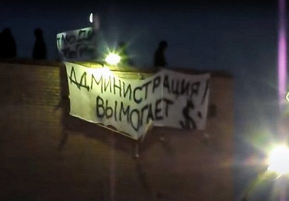 Зэки были уверены — на глазах общественности их не тронут. Вначале бунтующие вышли из помещений и отказались возвращаться обратно. А затем группа осужденных появилась на крыше одной из построек колонии с плакатами «Администрация вымогает $», «Пытают!», «Люди, помогите!», «Нас 1500 человек».