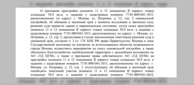 Всё началось с того, что в ноябре прошлого года Арбитражный суд Москвы принял иск от Правительства Москвы к ЦУМу о снятии с кадастрового учёта и исключении из ЕГРН здания по адресу ул. Петровка, 12, стр. 2. Эта пристройка считается незаконной, поэтому власти города требовали от компании за свой счёт снести её в течение месяца и привести освободившуюся территорию в соответствие с окружающим ландшафтом. Торговому дому также необходимо было провести повторную техническую инвентаризацию своих помещений на Петровке, 12 и заново поставить их на государственный кадастровый учёт.