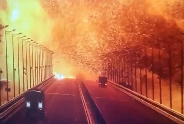 Ранним утром 8 октября на Крымском мосту взорвался большегрузный автомобиль. Взрывом были повреждены два автомобильных пролета в направлении Крыма, а на железнодорожной части моста загорелись топливные цистерны поезда, следовавшего в Краснодарский край.Жертвами взрыва стали пять человек — водитель фуры и четыре человека из машины, оказавшейся в зоне взрыва. Сотрудники ФСБ России установили, что взорвавшаяся фура перевозила рулоны с полиэтиленовой пленкой, внутри которых было спрятано взрывное устройство. По данным СМИ, его мощность могла достигать 22 тонн в тротиловом эквиваленте.