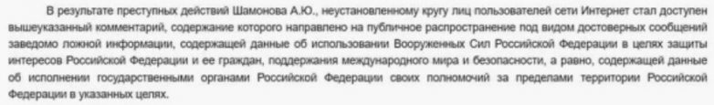 «<...> у Шамонова А.Ю. возник преступный умысел, направленный на публичное распространение под видом достоверных сообщений заведомо ложной информации содержащей данные об использовании Вооруженных сил РФ».