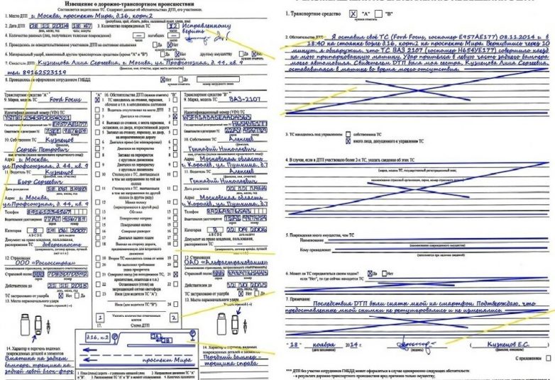 Так же внимание следует обратить на то, что «показания» участников аварии не должны противоречить друг другу. Иначе правомерность оформления ДТП без участия сотрудников ГИБДД может оказаться под вопросом. А расхождения могут возникнуть, например, если один и участников ДТП неправильно отразит выполненные его автомобилем маневры.