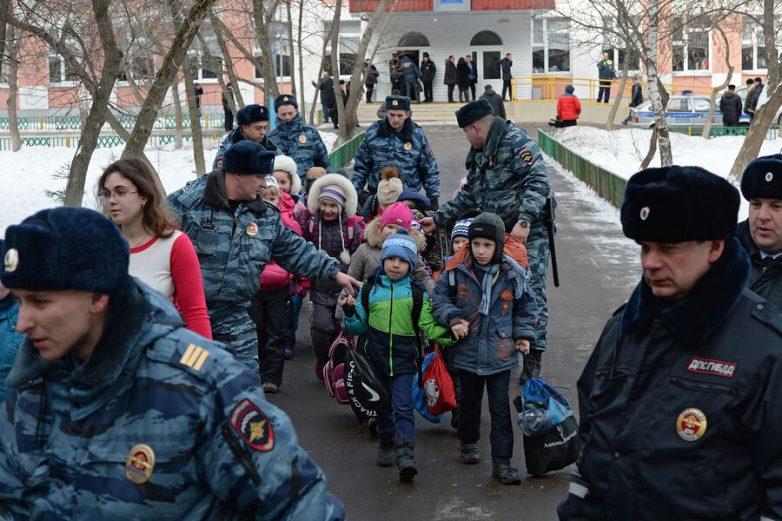 Сотрудники полиции выводят детей из московской школы №263, 3 февраля 2014 года