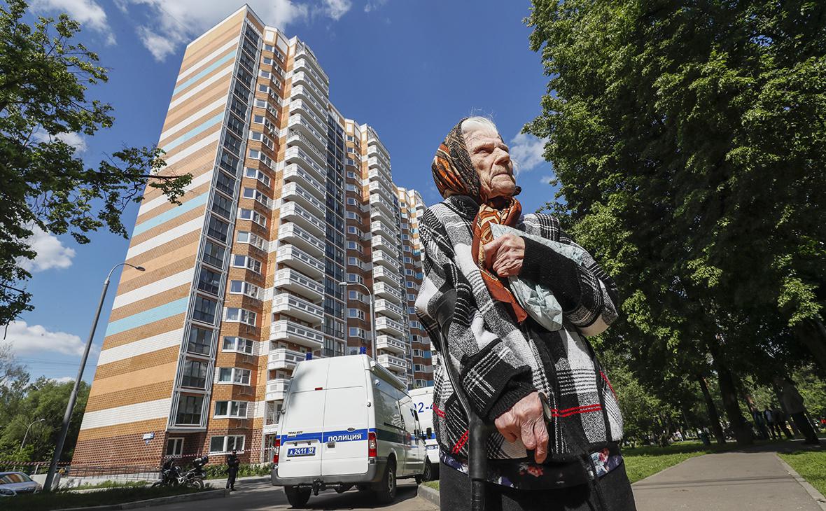 Пожилая женщина возле многоэтажного жилого дома, который получил повреждения после попадания беспилотного летательного аппарата (Фото: EPA / ТАСС)