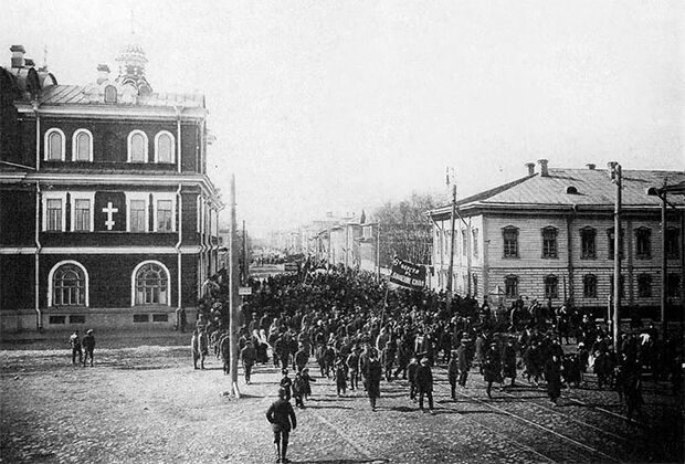Шествие 1 мая на Троицком проспекте. Архангельск, 1917 год