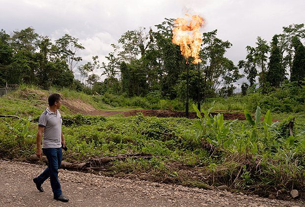 Мужчина идет рядом с языками пламени, вырывающимися из горелки на заводе государственной нефтяной компании Petroecuador в Лаго-Агрио, Эквадор