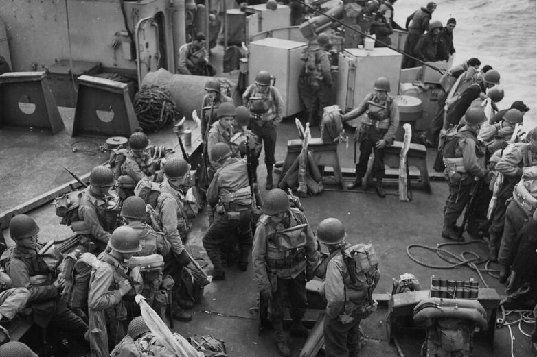 Американские солдаты на борту военно-транспортного судна Береговой охраны США перед началом операции, Нормандия, 6 июня 1944 года