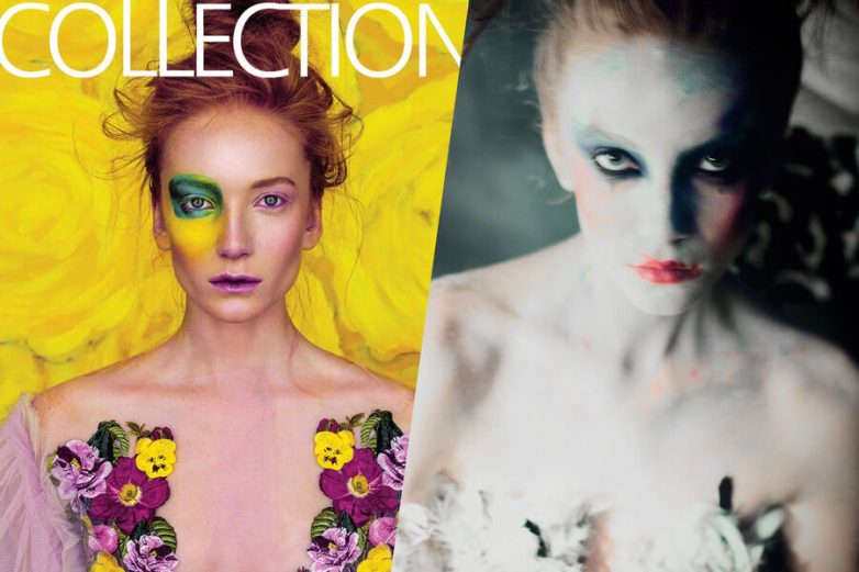 Модель Лилия Судакова на обложке издания Fashion Collection, 2014 год (слева) и во время одной из фотосессий (коллаж)