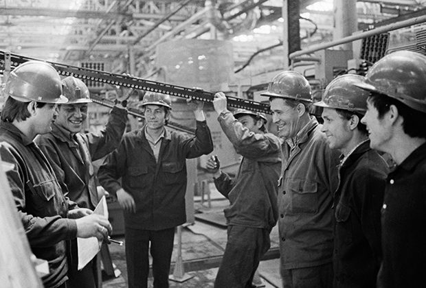 Передовая бригада монтажников на стройке завода «КамАЗ», 1975 год