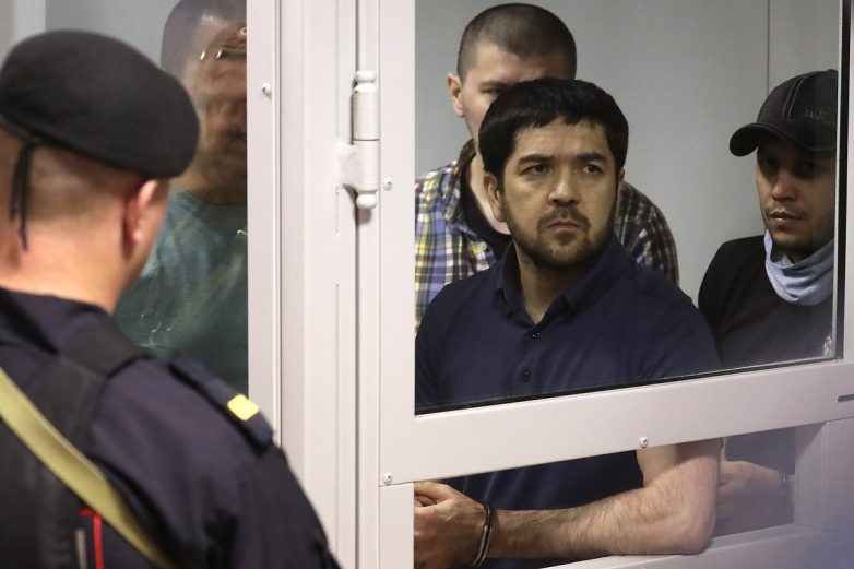 Члены «банды GTA» Анвар Улугмурадов, Зафартжон Гулямов, Умар Хасанов и Шерозджон Кодиров (слева направо на втором плане) во время оглашения приговора