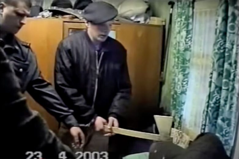 Денис Писчиков во время следственного эксперимента в кадре из передачи «Криминальная Россия»